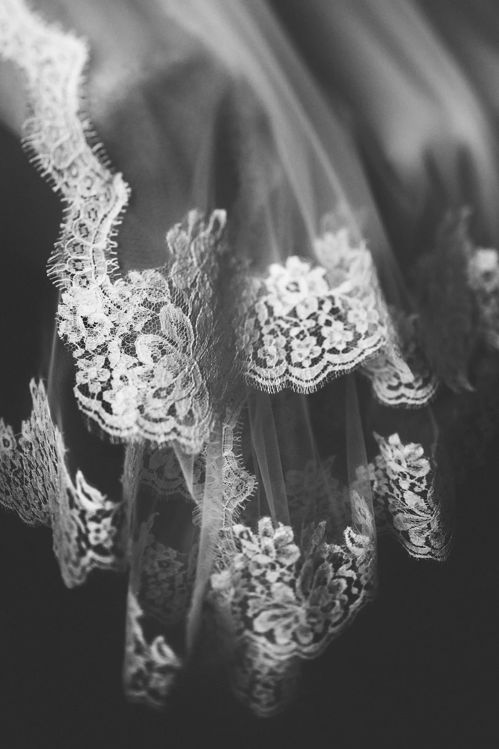 "I remember how I felt in the moment this photo was taken. Looking at my veil, admiring the delicate lace and seeing how it tied everything together, was the first time I ever felt truly bridal. Most women have their bridal moment when they select their dress, surrounded by an excited group of family and friends. For me that moment came alone in my bridal suite after my veil was placed on my head, watching it lay perfectly, albeit wildly, over my dress."