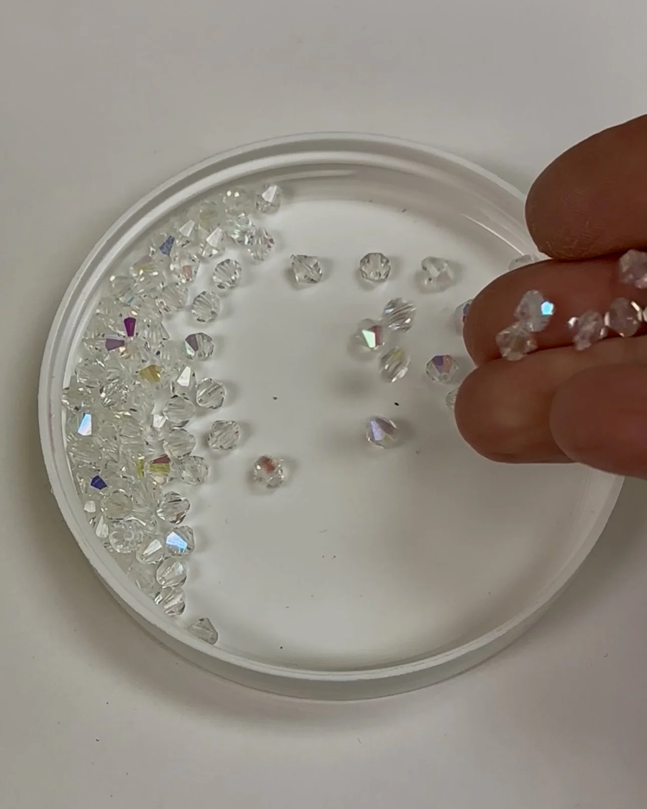 The cleaned crystals are ready to be used in Ally’s custom headpiece.