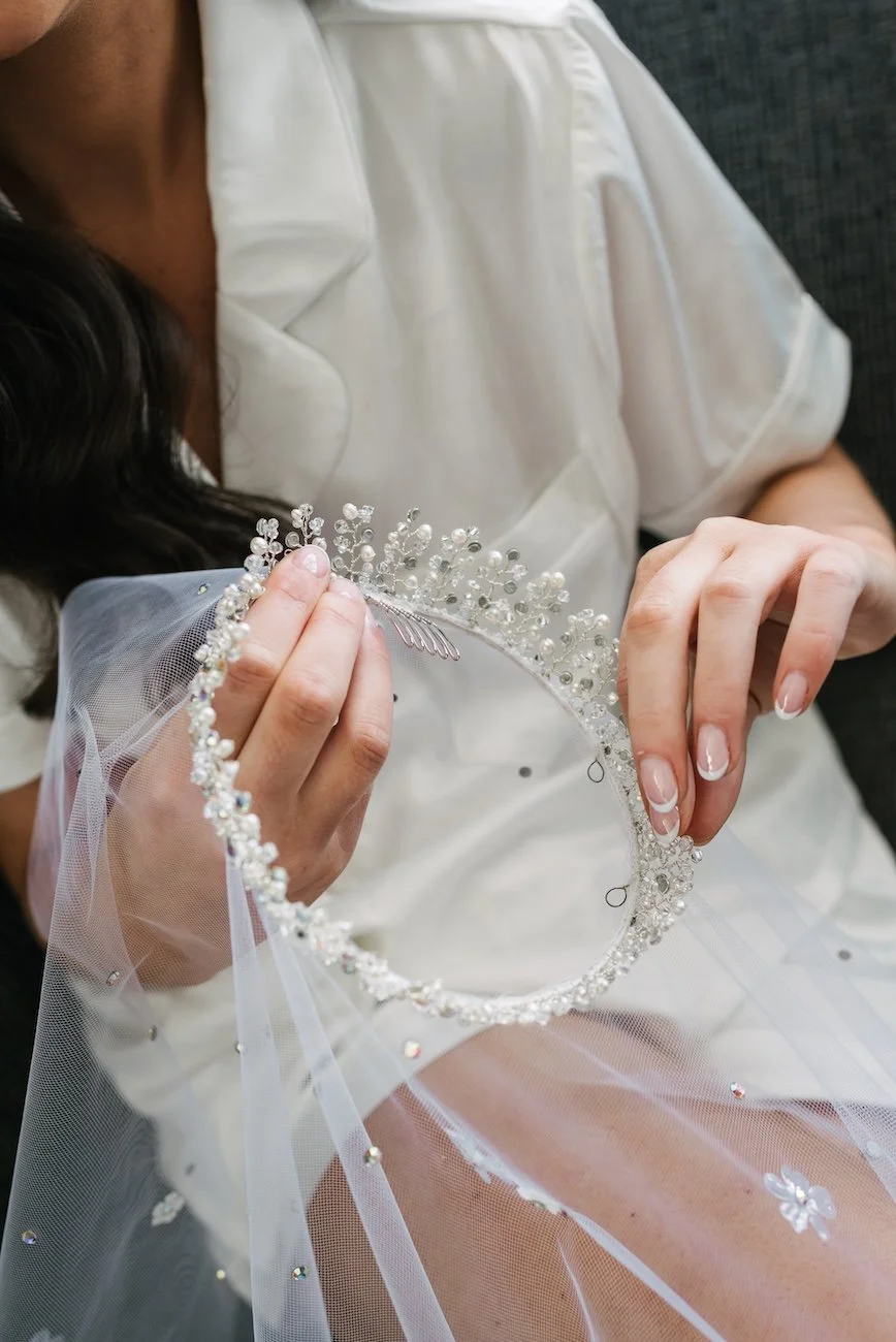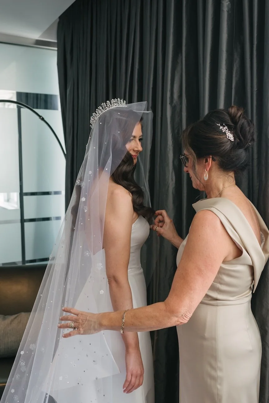 Attaching The Newly Designed Crown to Her Mom’s Wedding Veil