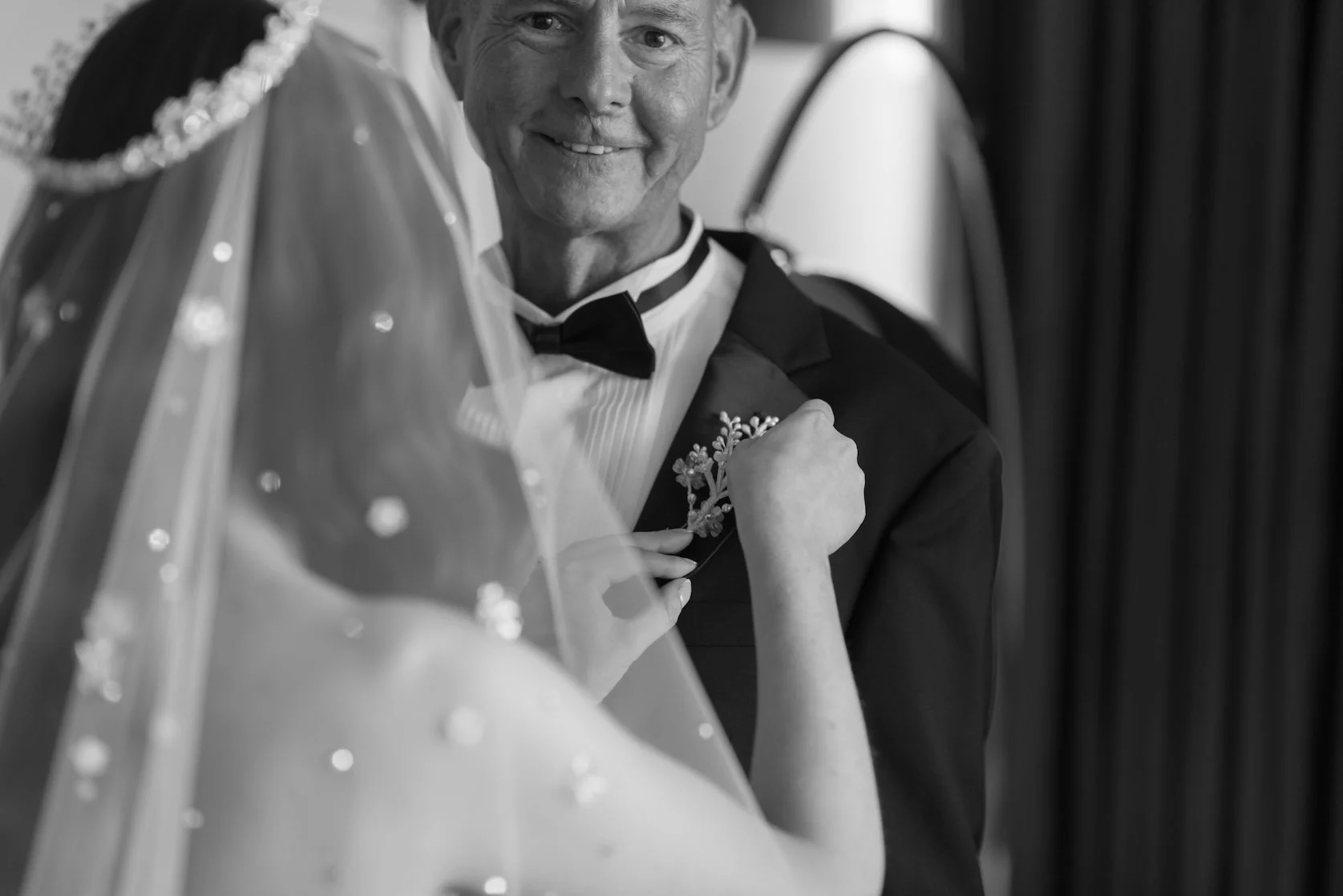 “My dad lovingly called the ‘First Look’ the quality assurance check. At my parents’ wedding, someone stepped on the veil, causing a big tear at the bottom. He looked at the back, where it was torn, and admired how it looked brand new. He was very impressed!”