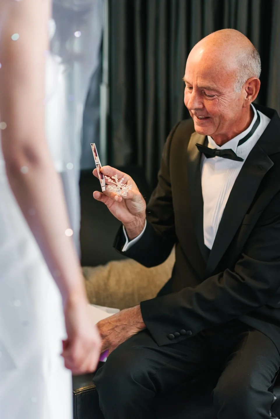 “This actually started as a joke during a family dinner. I shared that my sister and mom would be getting headpieces too, so we could all wear a little of mom’s headpiece. My dad chimed in, “What, nothing for me?” We all laughed at first, but when Marie said she could make one, there was no question he would wear it — and he did!”