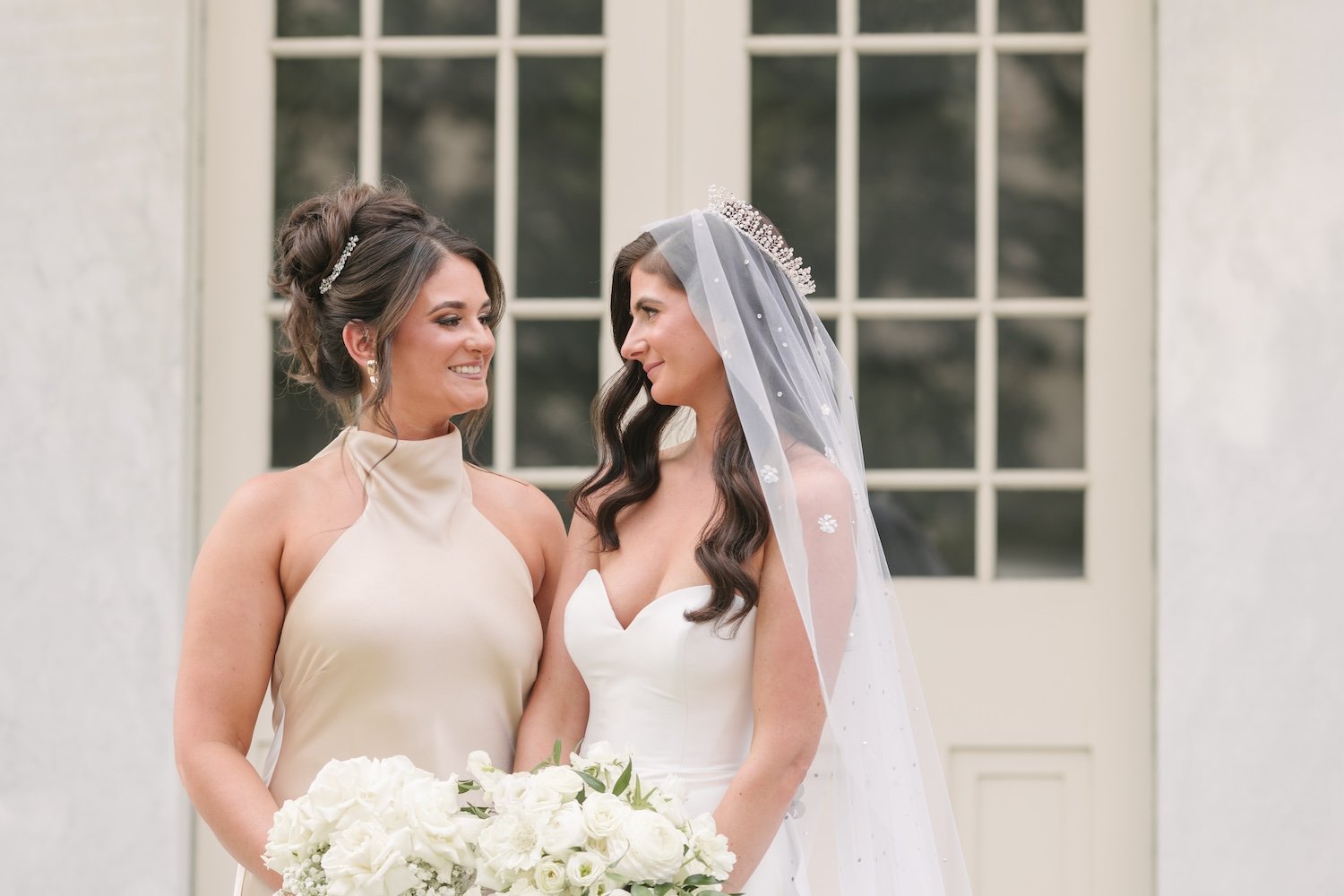 Aggie is wearing a custom bridal accessory designed from her mom’s headpiece and gifted by her sister, the bride.